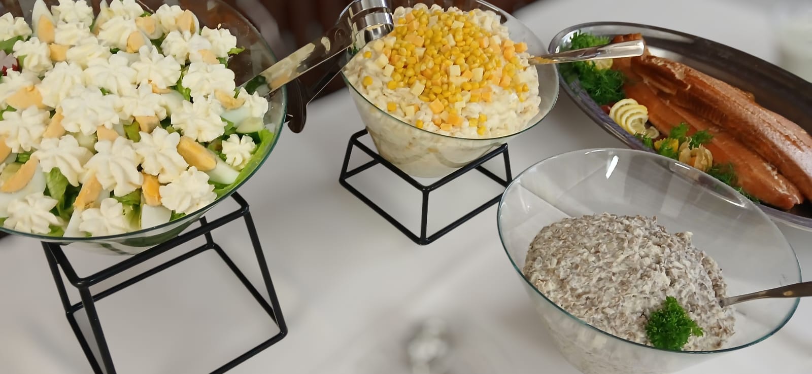 Teo teki kinkku- ja lohivoileipäkakkuja yo- juhliin ja Kaisa teki kerma-, kinuski-, gluteenittomia sekä vegaanisia kakkuja. Tarjolle tehtiin myös paljon muita ruokia.